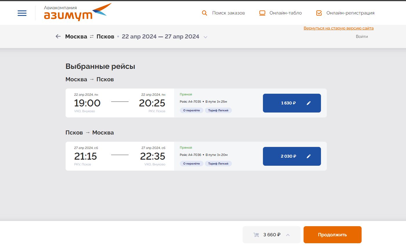 - Рейс туда (Москва - Псков): 22 апреля за 1630 руб.