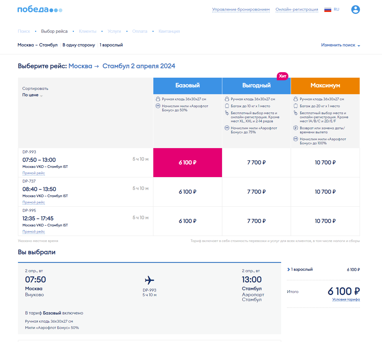 Рейс в одну сторону (Москва - Стамбул): 2 апреля 2024 года за 6100 руб.