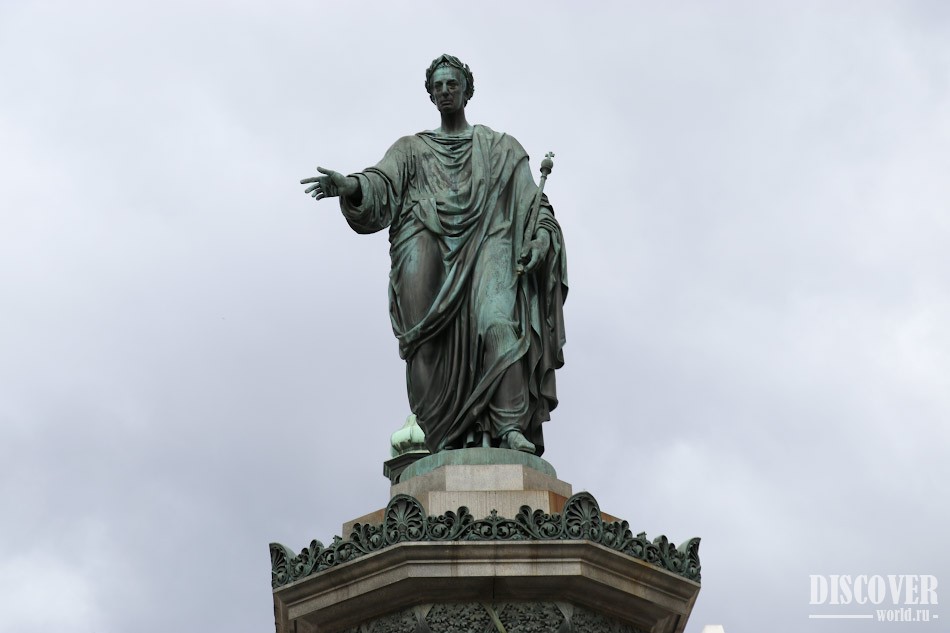 Восьмигранный корпус основания имеет рельефы восьми фигур - 4 мужских и 4 женских. Ниже можно увидеть набор рельефов, символизирующих различные виды деятельности подданных империи: торговля и промышленность, горное дело, сельское хозяйство, искусство и наука.