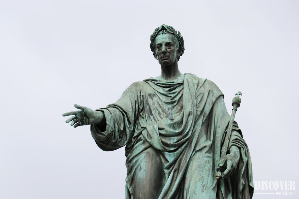 Император Франц изображен в полный рост на высоком постаменте, одетый в одежду в римском стиле.