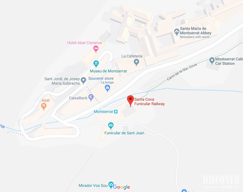 Фуникулер расположен чуть выше станции зубчатой железной дороги - кремальеры (Cremallera de Montserrat). При выходе со станции вам необходимо будет повернуть налево, пройти мимо центра туристической информации и чуть далее опять свернуть налево на лестницу (эта часть пути до фуникулеров Санта Кова и Сант-Жуан совпадают). Поднимитесь наверх по лестнице, затем вы увидите фуникулер (там есть указатели).