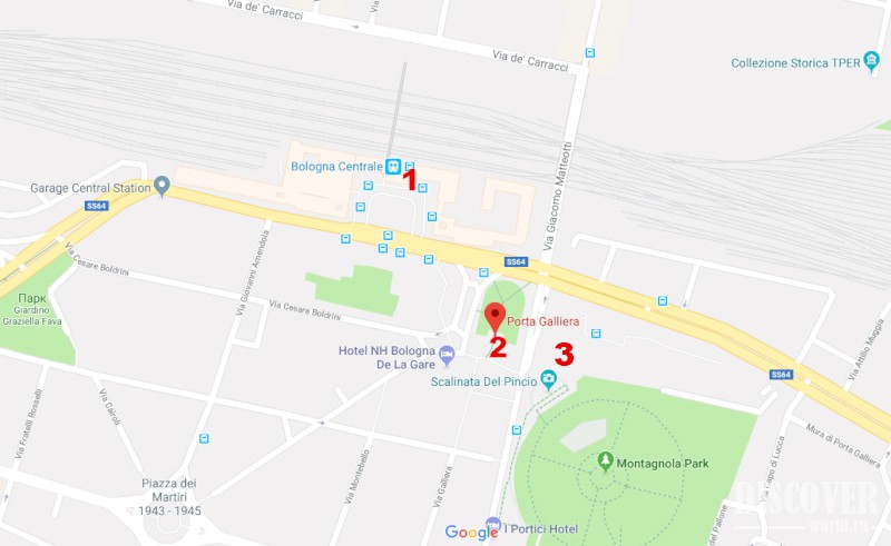 1-центральный вокзал Болоньи, 2-Porta di Galliera, 3-Rocca di Galliera